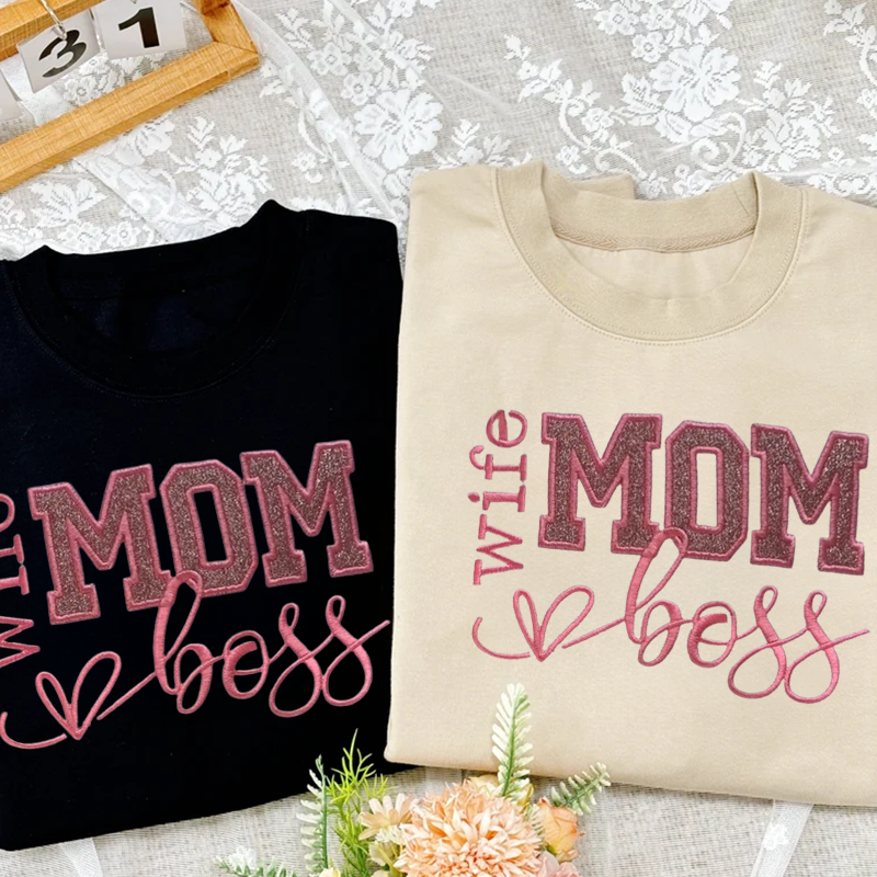 Empowering Design: Features the bold and inspiring phrase “Mom, Wife & Boss” in glitter applique and embroidered details, combining sparkle and sophistication for a standout look.
