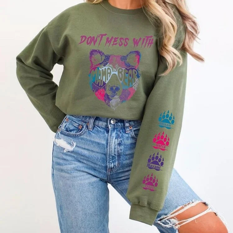 Don't Mess With Mama Bear Sweatshirt, Custom Kids' Names On The Sleeve Sweatshirt, Mama Bear Face Sunglasses Hoodie