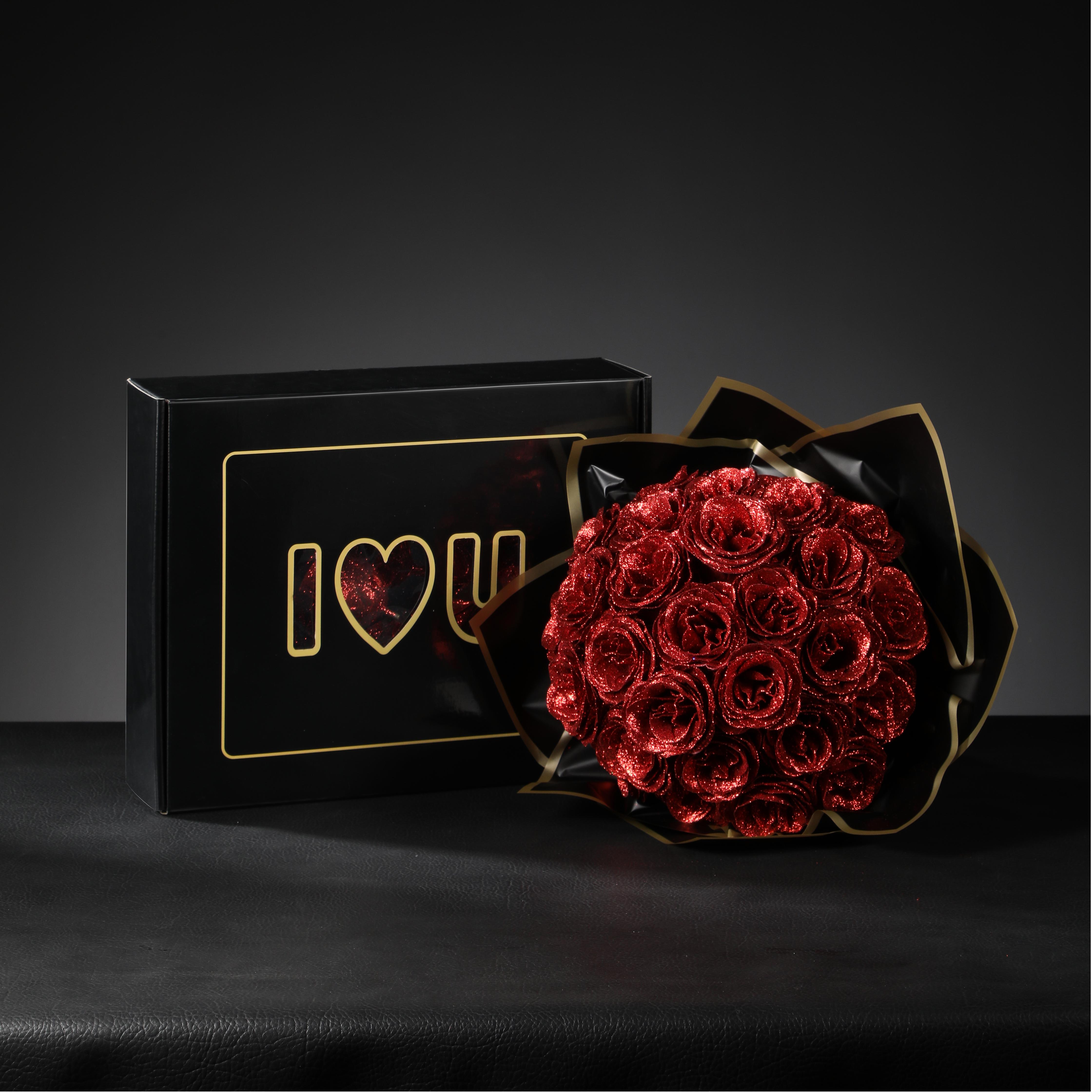 Glittering Roses: Our premium roses are adorned with a delicate layer of glitter, adding a touch of magic to each petal. The subtle shimmer creates an ethereal effect, making this bouquet a truly unique and unforgettable gift.