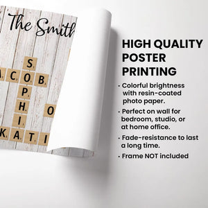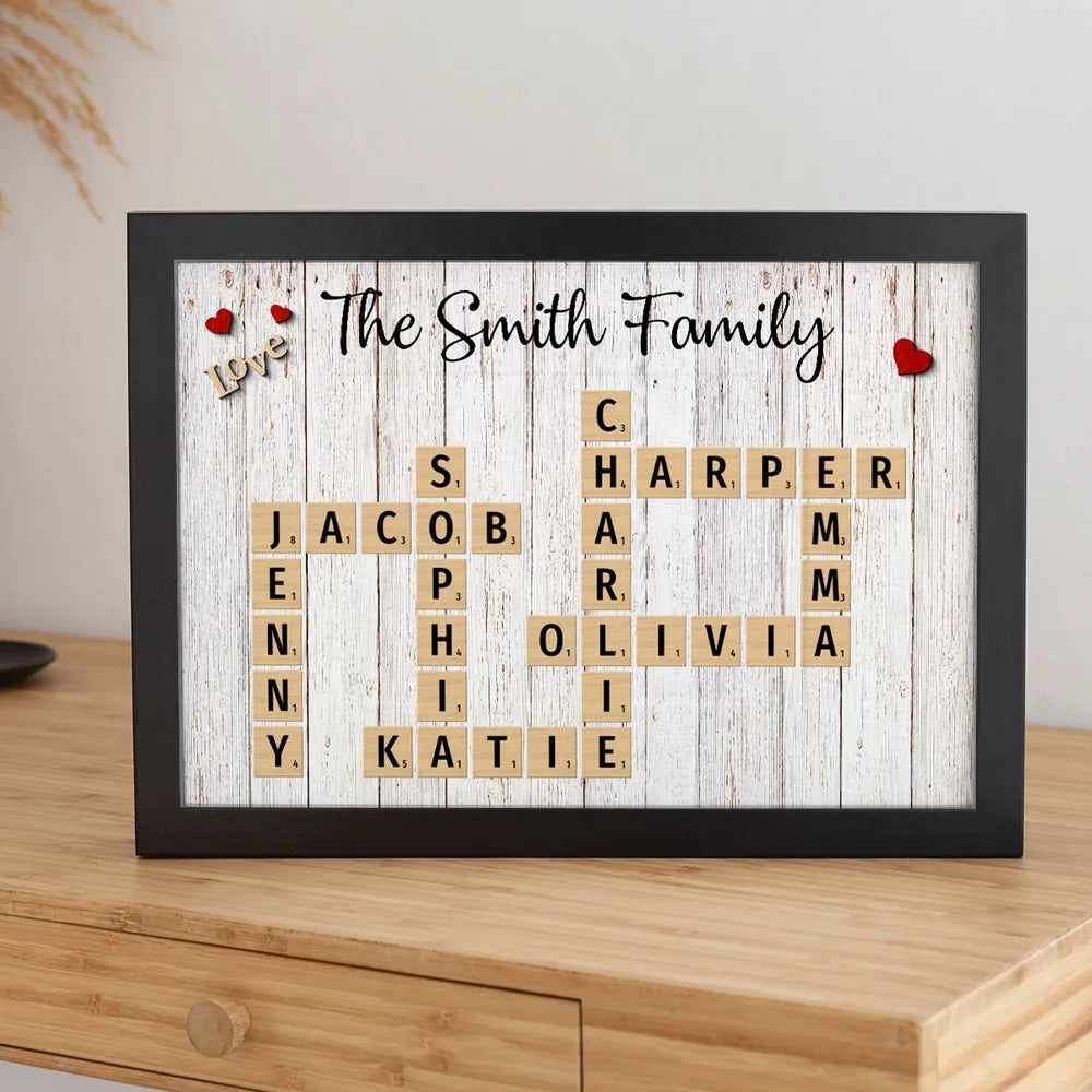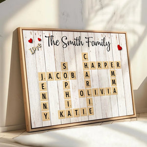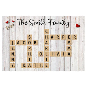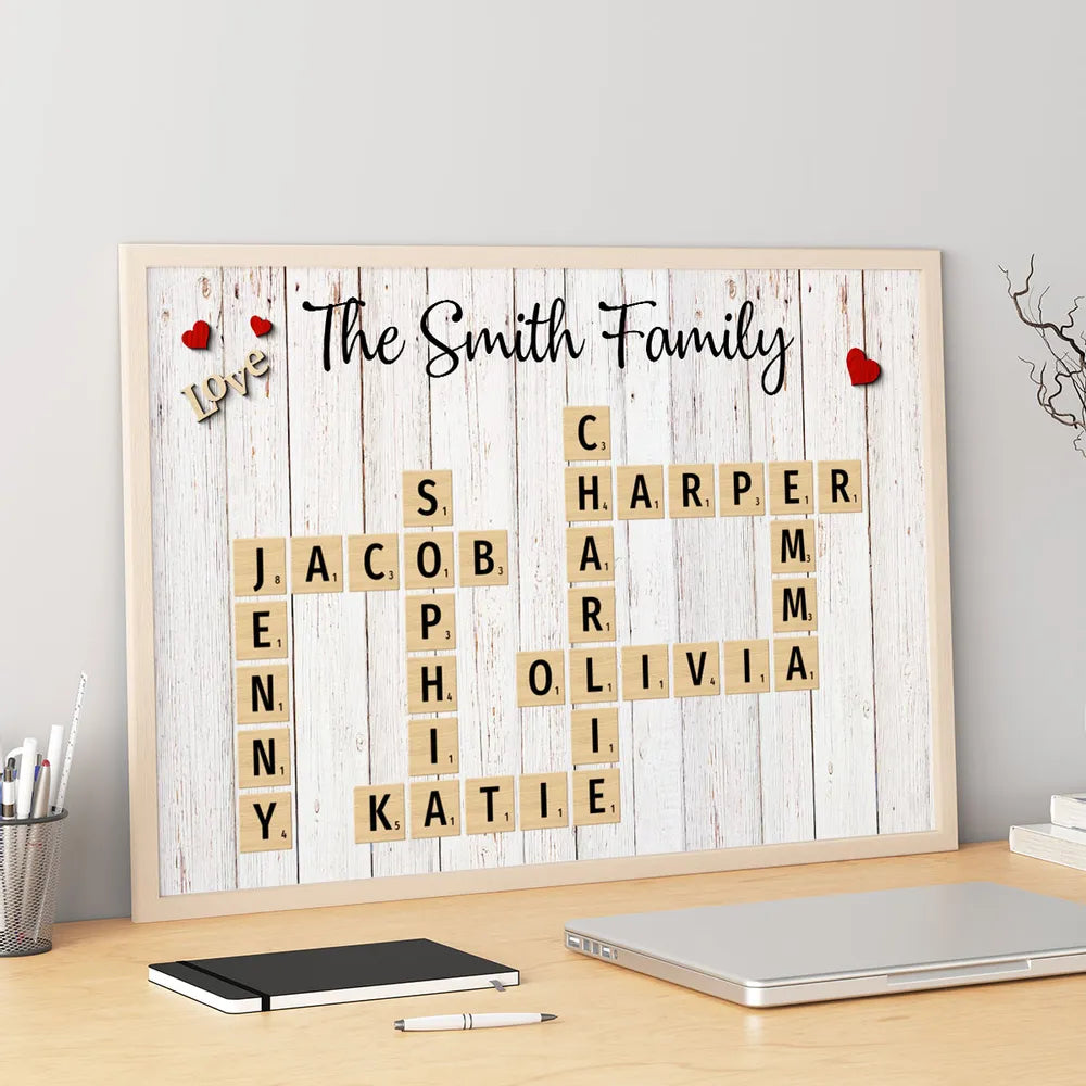 Transform your home decor into a celebration of family with our custom crossword puzzle poster. Inspired by the popular Scrabble game, this unique feature allows you to easily input the names of your loved ones, and our system automatically generates a one-of-a-kind crossword design. This innovative feature is exclusive to us, making your decor truly unique.