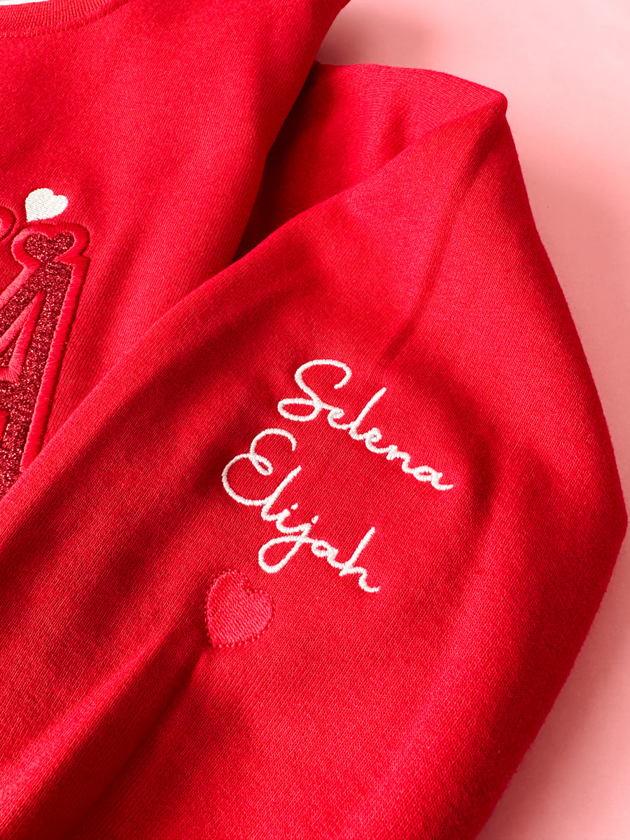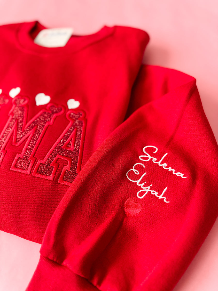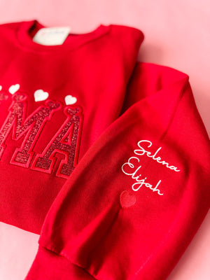 Embroidered Heart Mom Sweatshirt With Child's Name On The Sleeve