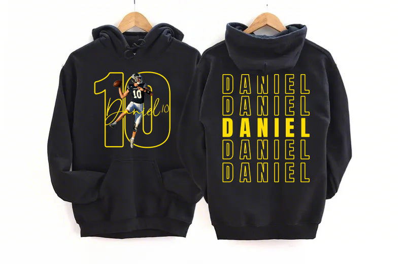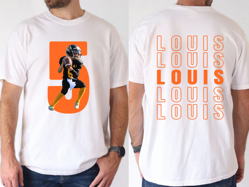 "Show your team pride as a family with our matching Game Day Tees! These custom football photo shirts let you and your little fans cheer together in style. Personalize with your favorite player’s name, team colors, or even a special photo to create unforgettable game day memories. Perfect for father-son duos, daddy-daughter teams, or the whole squad – because the best fans cheer together! 🏈🔥"