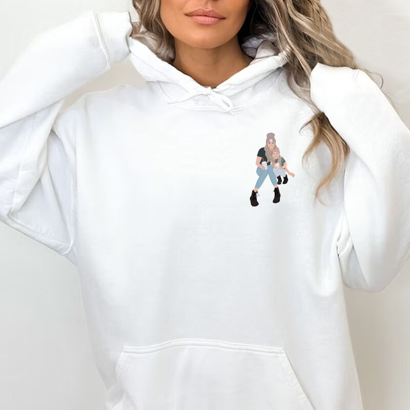 🎨 Upload your favorite photo of mom and kids, and we’ll transform it into a loving cartoon-style design printed on the front or back (or both!) of a cozy, high-quality hoodie. Every piece is made to order with care, detail, and lots of heart.