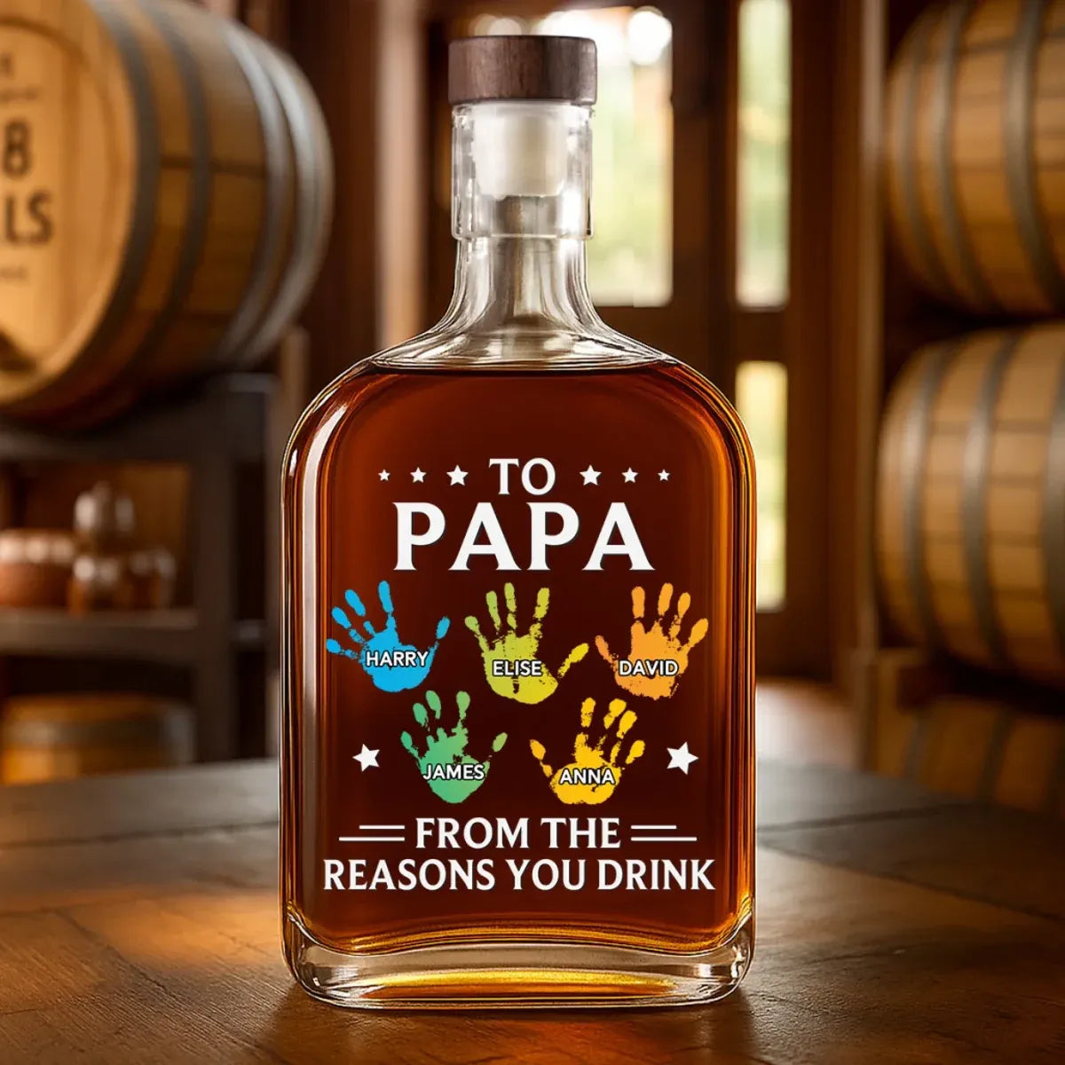 Featuring vibrant handprint artwork, each labeled with a child’s name, and a custom nickname like DAD, GRANDPA, PAPA, this bottle becomes a work of love — one that belongs proudly on any bar cart, shelf, or celebration table.
