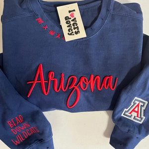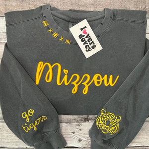 This one-of-a-kind unisex crewneck blends old-school varsity style with modern-day squad energy. Featuring bold 3D puff embroidery and hand-finished vintage distressing, it's made for fans who ride or die with their team — and want to wear it loud.