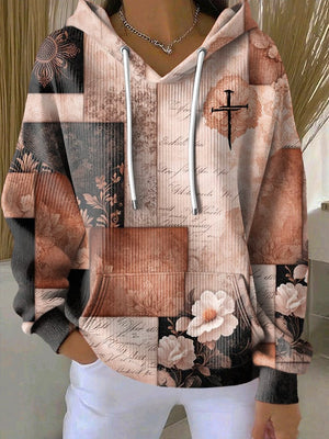 Women's Casual Retro Color Block Contrast Print Faith Texture Hoodie