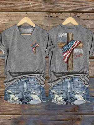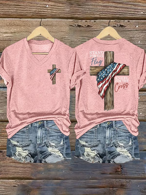 Women's Stand For The Flag Kneel For The Cross Printed Casual T-Shirt